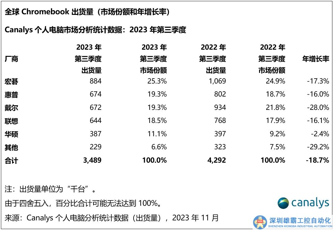 Canalys分析師Kieren Jessop表示,“由于此前美國市場對教育需求強勁,Chromebook在2023年第三季度的增長軌跡產生不利的影響,出貨量環(huán)比下降40%。在今年的早些時候,OEM趕在ChromeOS授權費上調前預先生產各類Chromebook機型,以利用美國政府最后一輪的緊急網絡接入補助(Emergency Connectivity Fund)。但結果是,積累的渠道庫存現(xiàn)在已經被清除,但同時廠商Chromebook的出貨出現(xiàn)了下滑。”
