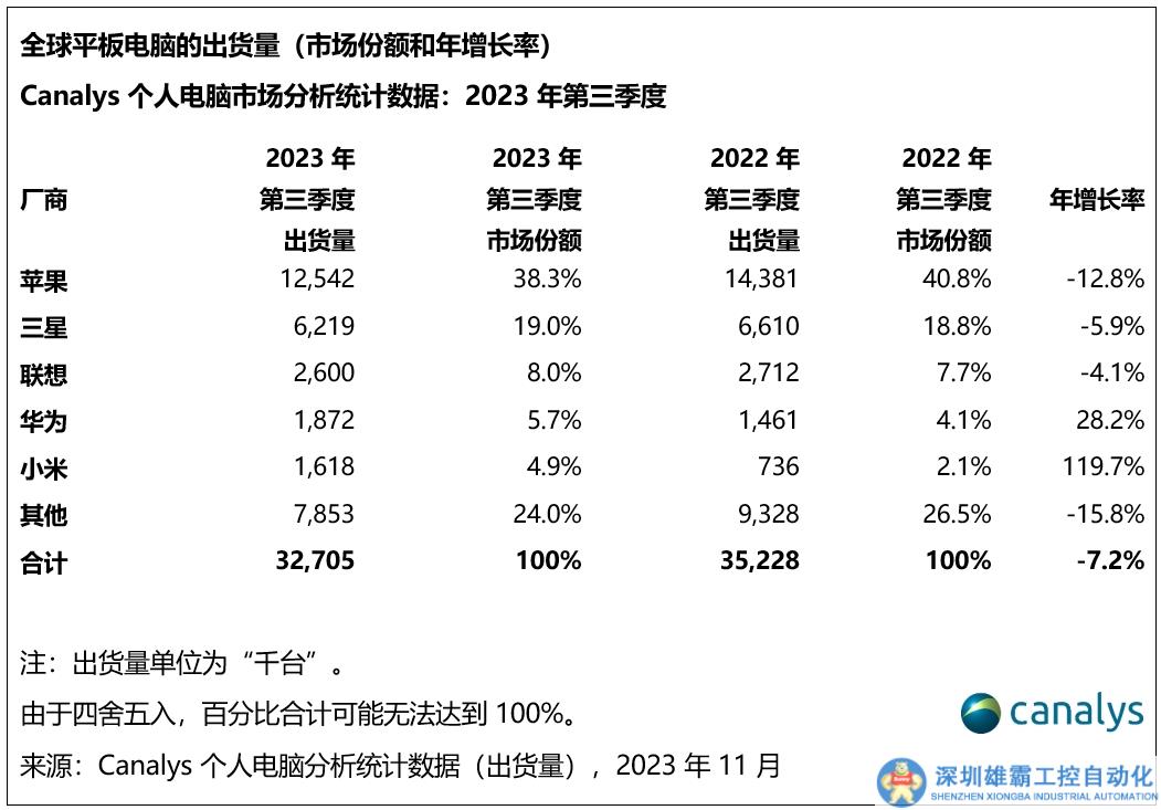智能手機廠商正在平板電腦市場上大展拳腳,尤其是致力于產品的創(chuàng)新和高性價比的中國廠商。2023年第三季度,華為和小米的排名雙雙超越亞馬遜。蘋果繼續(xù)排名第一,當季iPad出貨量達1,250萬臺,占據38%的市場份額。三星位居第二,出貨620萬臺,下滑6%,而聯(lián)想排名第三,出貨量達260萬臺。華為和小米分列第四和第五,小米首次進入前五,成為增長幅度最高的廠商。