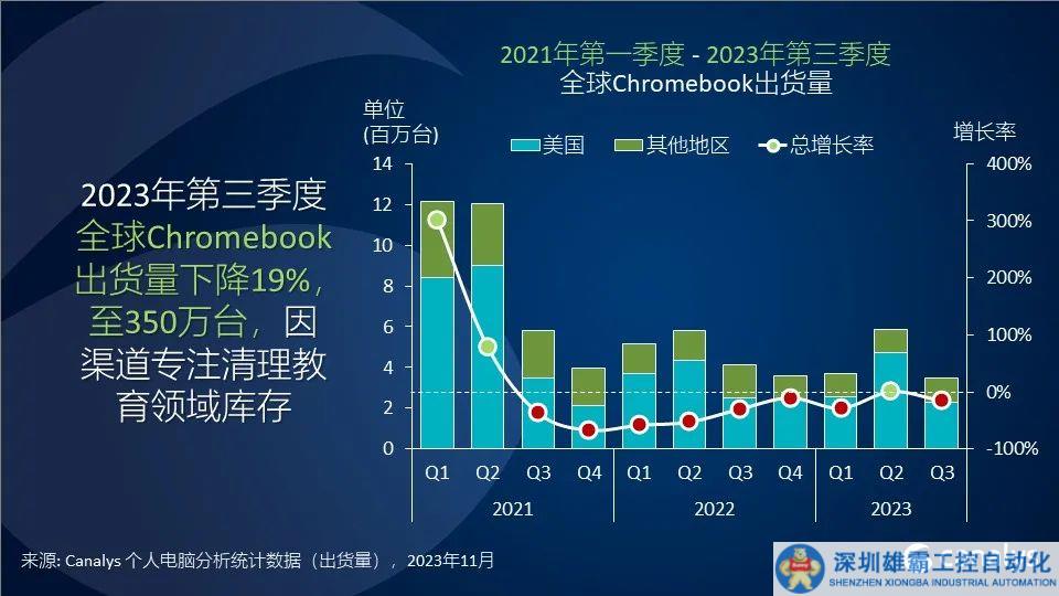 2023年第三季度,全球平板電腦出貨量達3,300萬臺,同比下跌7%,但環(huán)比增加8%,這反映出在重要的節(jié)日季前,平板電腦市場出現(xiàn)復蘇跡象,新進者在該領域也表現(xiàn)強勁。與此同時,渠道在返校季進行庫存清理,因此Chromebook在2023年第三季度的出貨量下跌19%至350萬臺。