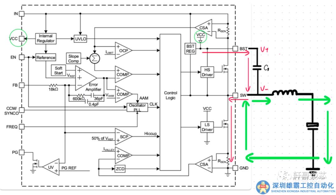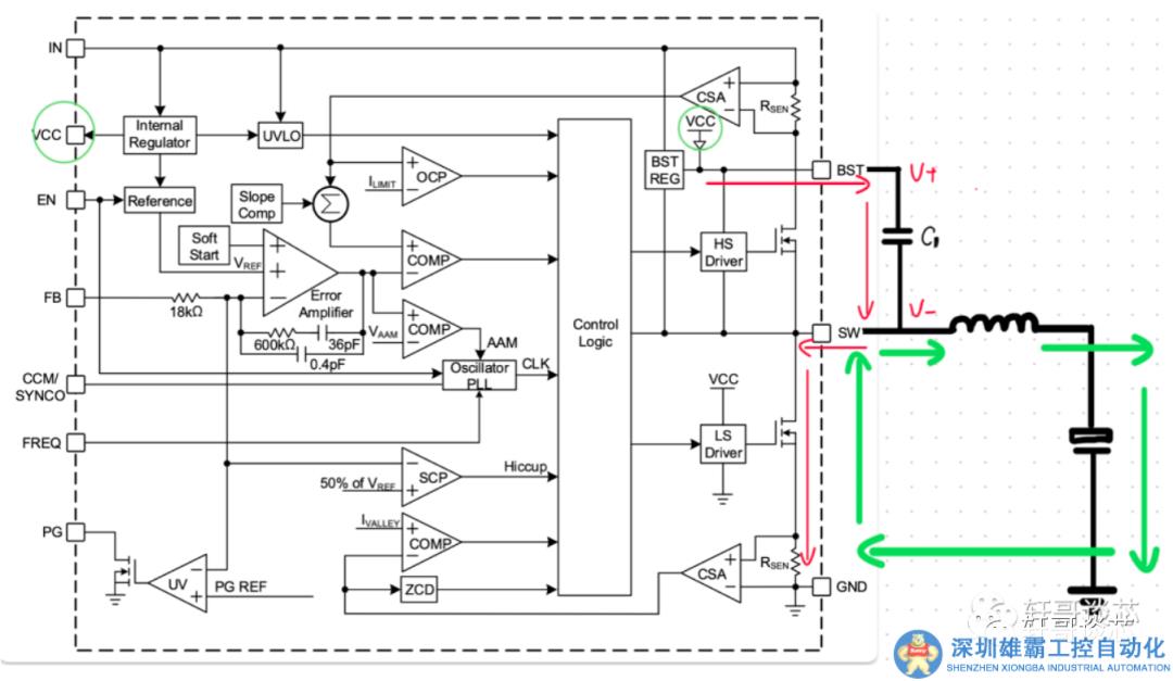 這里就有兩個(gè)電源,一個(gè)是 VCC 通過自舉電容對(duì) GND 回路的供電,一個(gè)是出能后的電感開始釋放電能,從而形成了一個(gè)電源,對(duì)負(fù)載和串在負(fù)載上的低邊 MOS 管放電。所以,從電路分析的等效模型角度,這里可以按照兩個(gè)電流去計(jì)算和理解,那么本質(zhì)上是兩個(gè)電源首先確定了在 MOS 的 DS 兩端的電壓差,也就是電場(chǎng)。這里假設(shè)是續(xù)流初期,電感兩端電勢(shì)還比較高,那么 SW 這一點(diǎn)的電壓就會(huì)低于 GND,也就是在整個(gè)系統(tǒng)中參考地去測(cè)能量是一個(gè)負(fù)值。那么,自舉電容的充電電流可以直接流向這個(gè)更低的電勢(shì)點(diǎn)。因此這個(gè)地方的電流如果測(cè)量的話,一定是綠色箭頭的方向,不會(huì)同時(shí)存在一個(gè)紅色電流的回路。