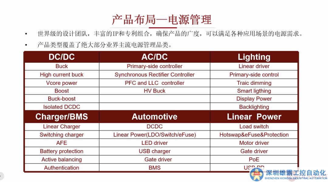 六大產(chǎn)品線分別是:DC/DC、AC/DC、照明、線性、Charger/BMS、汽車和充電相關(guān)的產(chǎn)品。