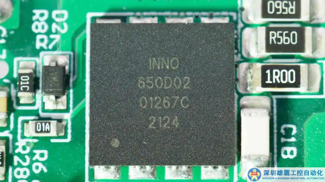 開關(guān)管來自英諾賽科,型號(hào)INN650D02,額定耐壓為650V,峰值耐壓750V,導(dǎo)阻低至0.2Ω,符合JEDEC標(biāo)準(zhǔn)的工業(yè)應(yīng)用要求,支持ESD保護(hù),支持開爾文源極。最高工作溫度150℃。