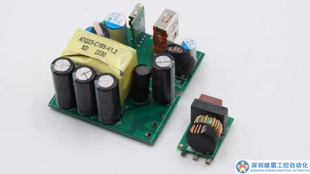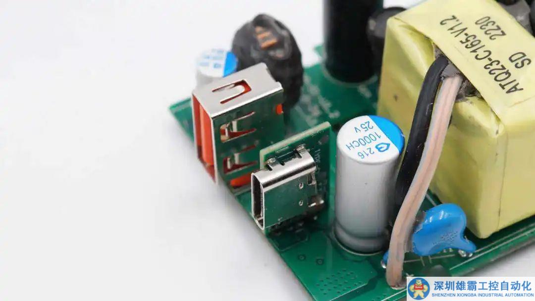 PCBA模塊正面一覽,輸入端焊接一塊小板,焊接保險(xiǎn)絲以及共模電感。下方焊接變壓器,左側(cè)焊接USB-C母座小板,USB-A插座,濾波電容和降壓電感。