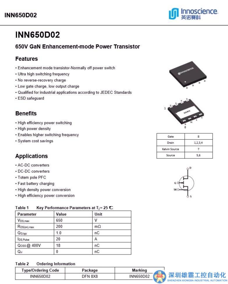 INN650D02 “InnoGaN”開關(guān)管高頻特性好,且導(dǎo)通電阻小,適合高頻高效的開關(guān)電源應(yīng)用,采用DFN8*8封裝,具備超低熱阻,散熱性能好,適合高功率密度的開關(guān)電源應(yīng)用。