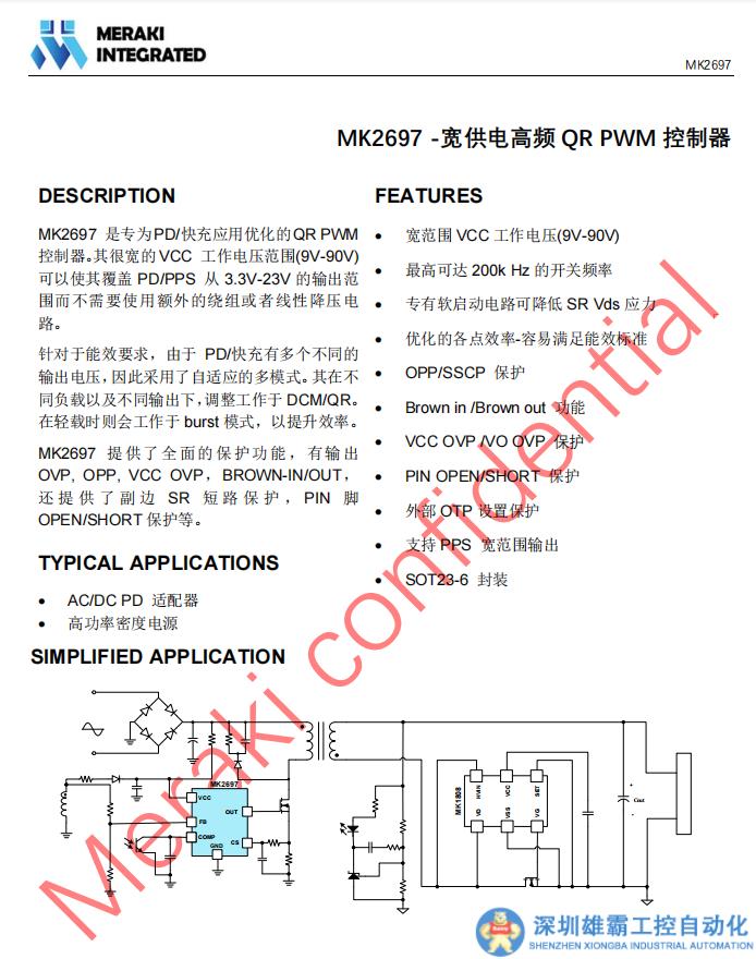 開關(guān)電源主控芯片采用茂睿芯MK2697,這是專為PD/快充應(yīng)用優(yōu)化的QR PWM控制器。該控制器寬VCC工作電壓范圍(9V-90V) 可以使其覆蓋PD/PPS從3.3V-23V的輸出范 圍而不需要使用額外的輔助繞組或者線性降壓電路。