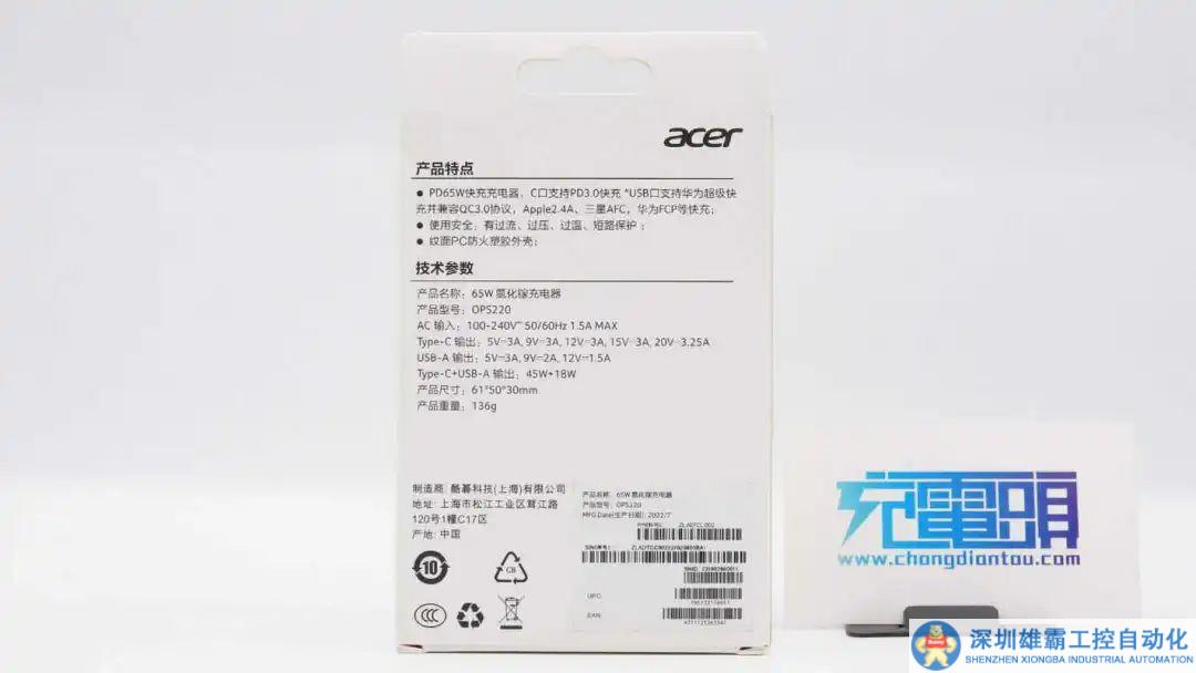 包裝盒正面印有Acer品牌、充電器名稱、機(jī)身頂面簡(jiǎn)圖、多重保護(hù)以及可適配設(shè)備。