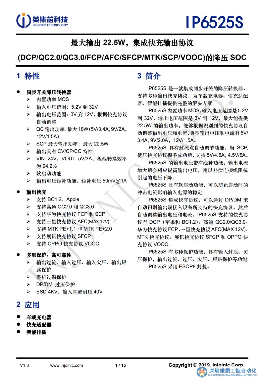 USB-A口降壓芯片采用英集芯IP6525S,是一顆集成同步開關(guān)的降壓轉(zhuǎn)換器,支持多種快充協(xié)議,支持車載充電器,快充適配器和排插應(yīng)用。芯片內(nèi)置功率管,支持32V電壓輸入,支持22.5W快充輸出。