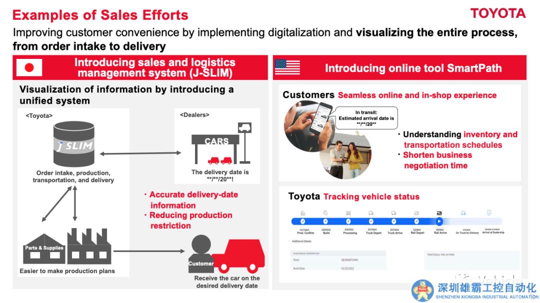 這些物流能力對(duì)于中國汽車出海未來都是值得學(xué)習(xí)的,畢竟這些都是成本,這些成本控制會(huì)比讓員工“內(nèi)卷”來的更高級(jí)和人性。在銷售方面,豐田表示正在利用數(shù)字化轉(zhuǎn)型建立一個(gè)連接生產(chǎn)、運(yùn)輸和銷售的系統(tǒng),為客戶提供準(zhǔn)確的交付日期信息,并快速無浪費(fèi)地交付車輛。這個(gè)其實(shí)中國電商做的很好,我們中國的新勢力應(yīng)該也做了這些,我記得是蔚來汽車,應(yīng)該和下圖豐田設(shè)計(jì)的交付狀態(tài)一樣,但是狀態(tài)我記得最少幾周才更新,其實(shí)只能說框架有了,但是細(xì)節(jié)打通還是有不少路程要走。
