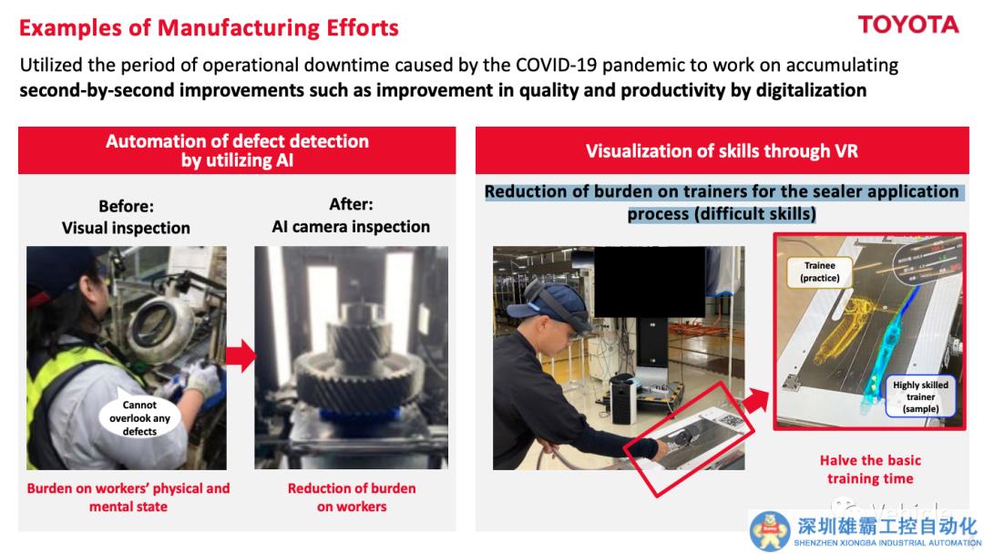 生產(chǎn)方面 ,豐田的TPS(豐田生產(chǎn)系統(tǒng))將汽車供應(yīng)鏈整合讓生產(chǎn)系統(tǒng)非常具有彈性,甚至是在疫情等特殊情況下,豐田的TPS的最小庫存和拉動(dòng)生產(chǎn)系統(tǒng)的原則都是在所有汽車行業(yè)表現(xiàn)最好的。豐田的TPS里面例如靈活的最小庫存,多供應(yīng)商原則,信任的供應(yīng)商關(guān)系,都是非常值得學(xué)習(xí)的方面。在制造業(yè)的第一線,豐田會(huì)通過采用AI等數(shù)字技術(shù)幫助工廠提升效率以及穩(wěn)健,例如視覺AI檢測產(chǎn)品質(zhì)量,而不是之前的人來做質(zhì)檢;通過數(shù)字化來培訓(xùn),而不是培訓(xùn)師。
