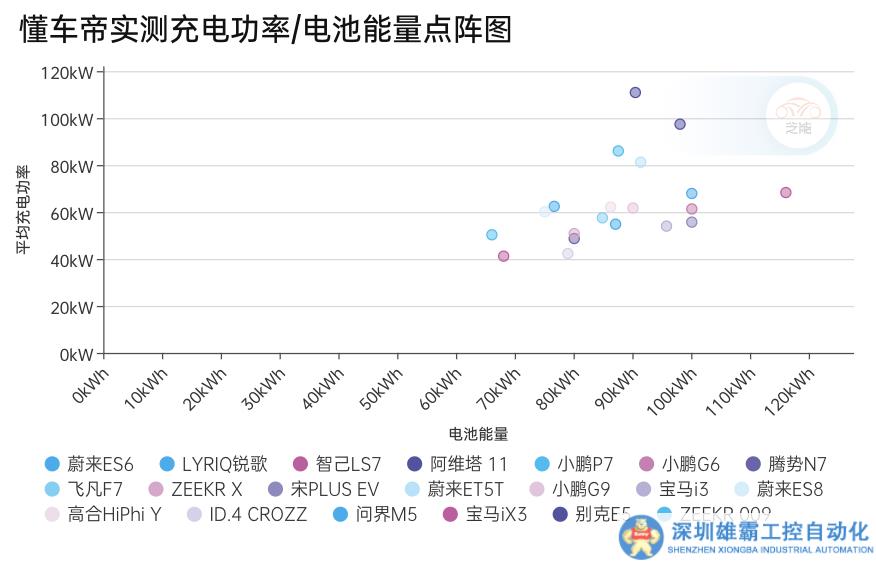 如果將電池能量設(shè)定為X軸,平均充電功率設(shè)定為Y軸,我們可以得到一組點(diǎn)陣圖,如下所示。需要注意的是,懂車帝的測試范圍是從電量的0%至99%,這比常規(guī)的充電評(píng)測標(biāo)準(zhǔn)(通常選取電量的5%至80%)更為嚴(yán)格。因此,這段數(shù)據(jù)可以作為評(píng)估電池性能,以及日常使用的參考依據(jù)。