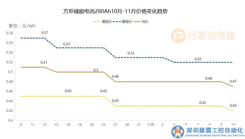受海外市場(chǎng)需求下滑影響,10月儲(chǔ)能電芯市場(chǎng)訂單量縮減明顯。據(jù)SMM鈷鋰新能源數(shù)據(jù)顯示,10月儲(chǔ)能型方形磷酸鐵鋰電池280Ah均價(jià)跌至0.5元/Wh,10月27日更是下降至0.48元/Wh。