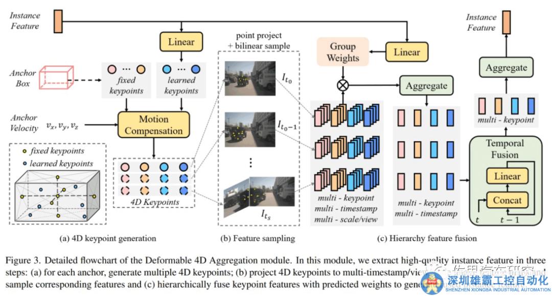 在Sparse4D的decoder 中,最重要的是Deformable 4D Aggreagation模塊。這個模塊主要負(fù)責(zé)instance與時序圖像特征之間的交互,如上圖所示,主要包括三個步驟: