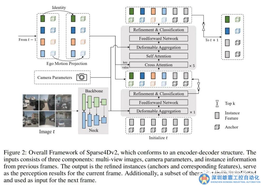 Sparse4D也采用了Encoder-Decoder 結(jié)構(gòu),其中Encoder包括image backbone和neck,用于對多視角圖像進(jìn)行特征提取,得到多視角多尺度特征圖。同時,cache 多張歷史幀的圖像特征用于在decoder 中提取時序特征;Decoder為多層級聯(lián)形式,輸入時序多尺度圖像特征圖和初始化instance,輸出精細(xì)化后的instance,每層decoder包含self-attention、deformable aggregation和refine module三個主要部分。