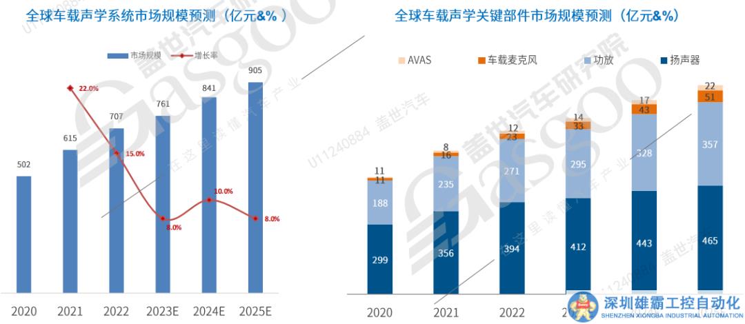 從整體市場(chǎng)來(lái)看,隨著高階座艙聲學(xué)技術(shù)的不斷迭代升級(jí),蓋世汽車研究院預(yù)計(jì)2025年全球車載聲學(xué)系統(tǒng)市場(chǎng)將突破900億元。作為車載聲學(xué)音響系統(tǒng)核心子部件,功放產(chǎn)品將朝向獨(dú)立化、數(shù)字化方向發(fā)展,AVAS產(chǎn)品則朝向集成化和定制化方向發(fā)展,揚(yáng)聲器則注重?cái)?shù)量疊加和空間環(huán)繞布局。