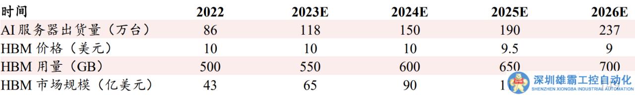 HBM的平均售價是DRAM的三倍以上,受到產(chǎn)能限制和生成式AI等應用的推動,價格一直上漲。根據(jù)TrendForce數(shù)據(jù),高端AI服務器GPU已普遍采用HBM,預計2023年全球HBM需求量將年增近六成,達到2.9億GB,2024年將再增長三成。預測從2023到2027年,HBM市場的復合年均增長率達到82%。根據(jù)DRAMexchange的數(shù)據(jù),2022年7月31日8Gb DDR4合約價格為2.88美元,2023年同日價格為1.34美元。假設HBM價格為DDR4的5倍,2023年全球AI服務器存儲市場規(guī)模預計為76億美元,預計2026年能達到492.4億美元,2023-2026年CAGR為86.4%。