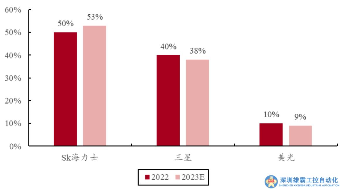 目前HBM市場主要由SK海力士、三星和美光所壟斷。2022年,SK海力士占據(jù)了市場的50%,三星約40%,美光約10%。SK海力士和三星的市占率預計在2023-2024年間將會持平,達到約95%的總市場份額。美光則專注于開發(fā)HBM3e產(chǎn)品,但可能略有下滑。