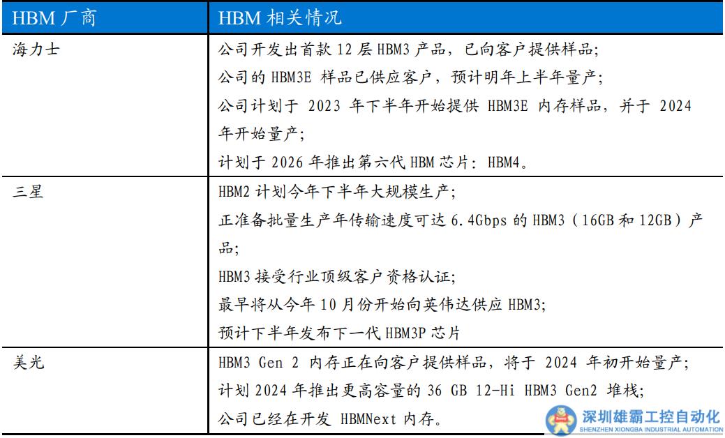 SK海力士于2013年率先推出HBM1,2017年推出HBM2,2018年JEDEC推出HBM2E規(guī)范。2021年10月, SK海力士首創(chuàng)于并于2022年6月量產(chǎn)HBM3,三星也將于2023年末至2024年初量產(chǎn)。SK海力士被認為是目前唯一可以實現(xiàn)HBM3量產(chǎn)的廠商。他們最新開發(fā)的HBM3E數(shù)據(jù)傳輸速率提升了25%。三星和美光也積極布局HBM新產(chǎn)品,加速推動12層HBM內(nèi)存的生產(chǎn)。美光的HBM3 Gen 2計劃于2024年初量產(chǎn),并在2022年宣布推出業(yè)界首款8層24GB HBM3 Gen2內(nèi)存芯片。