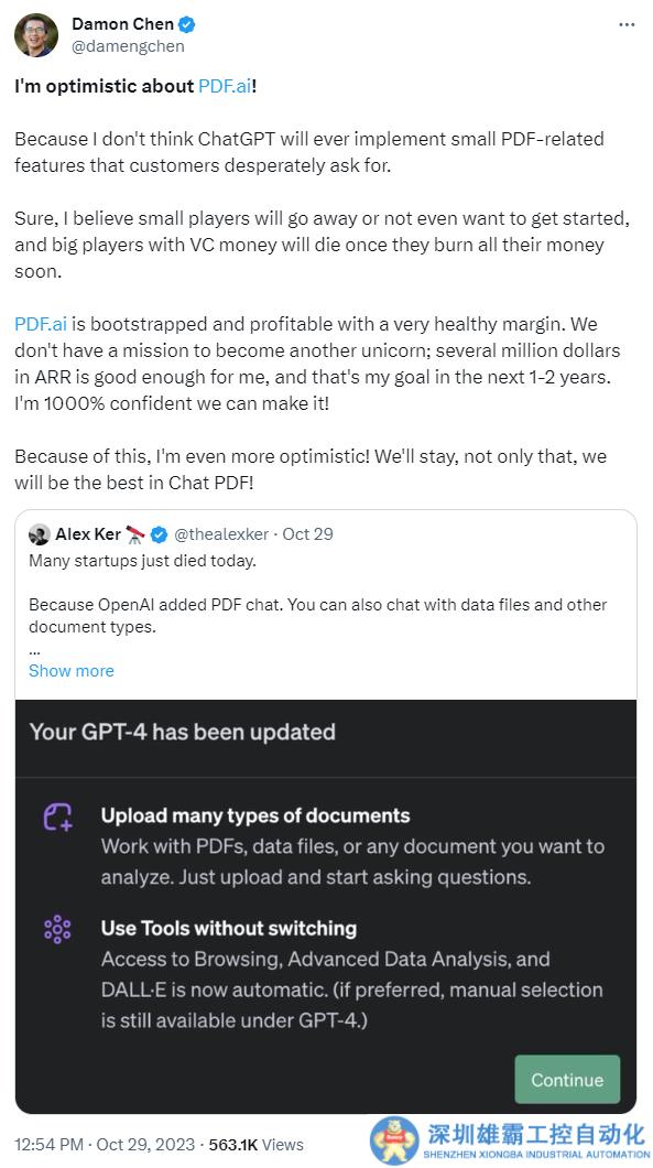 PDF.ai的創(chuàng)始人Damon Chen就是直接受害者,PDF.ai的主要功能是讓模型閱讀PDF文件,結(jié)果10月底ChatGPT也更新了這項(xiàng)能力。但Damon Chen卻非常淡然:“我們的使命不是成為另一家獨(dú)角獸,幾百萬(wàn)美金的年收入已經(jīng)足夠了”。